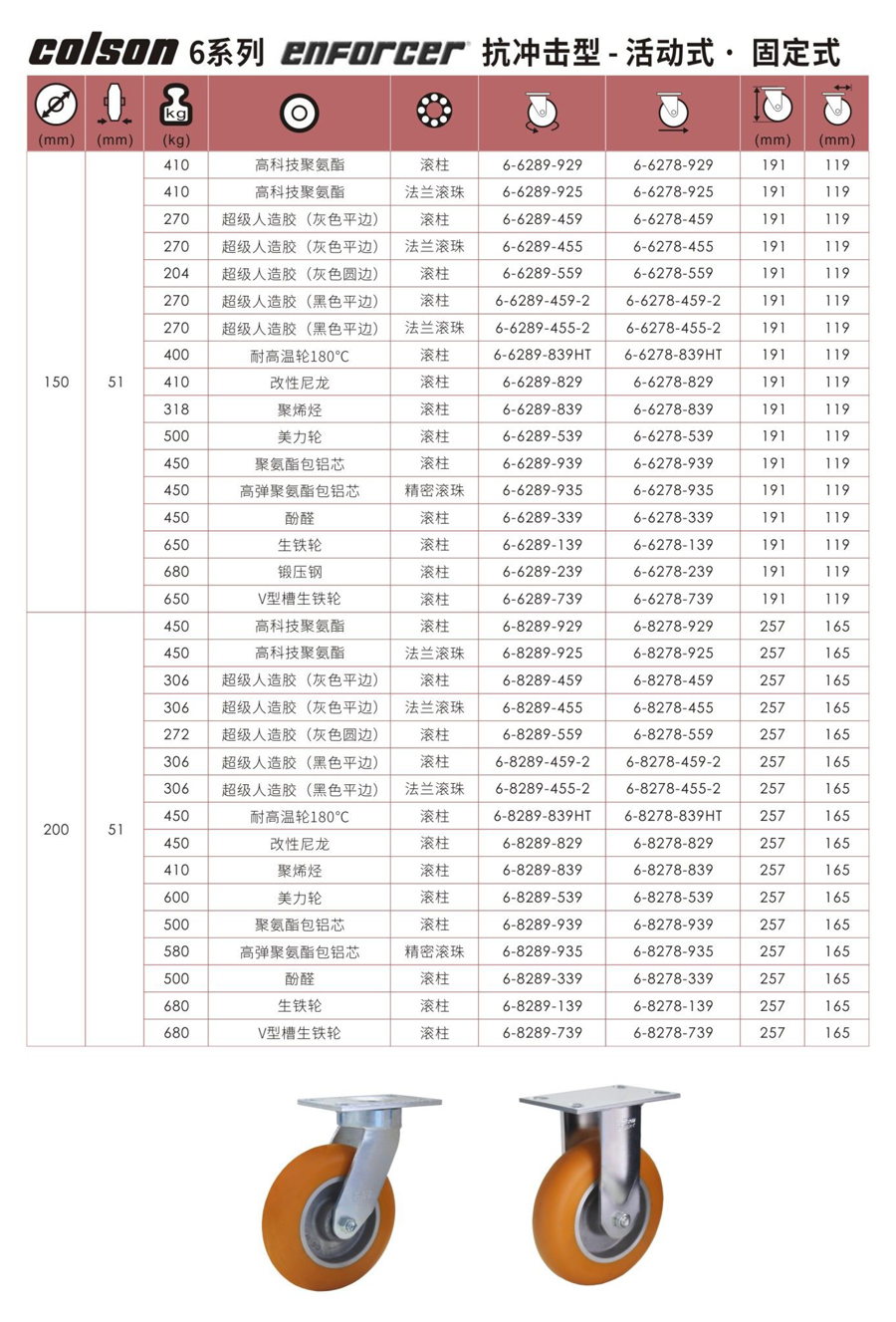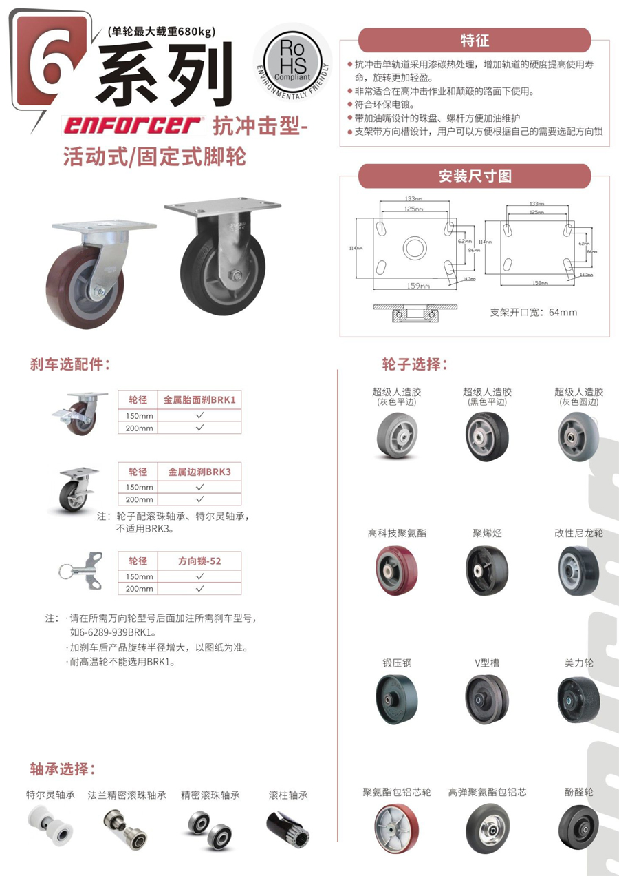 6系列 抗冲击型活动式/固定式脚轮,单轮最大载重680kg。