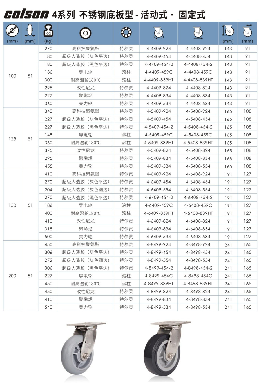 4系列 不锈钢底板型活动式/固定式脚轮,单轮最大载重560kg